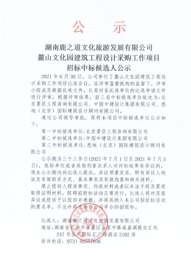 麓山文化園建筑工程設(shè)計(jì)采購(gòu)工作項(xiàng)目招標(biāo)中標(biāo)候選人公示