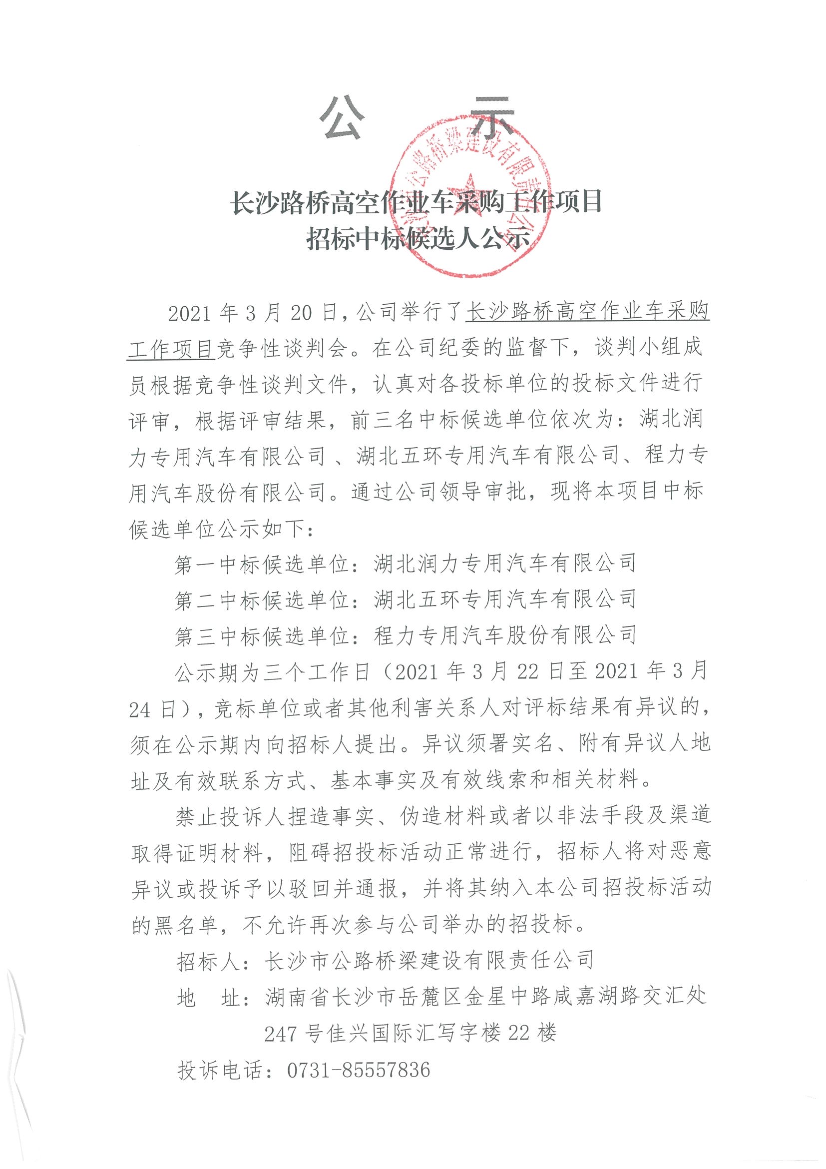 長沙市公路橋梁建設(shè)有限責(zé)任公司關(guān)于高空作業(yè)車采購工作項目招標(biāo)中標(biāo)候選人公示
