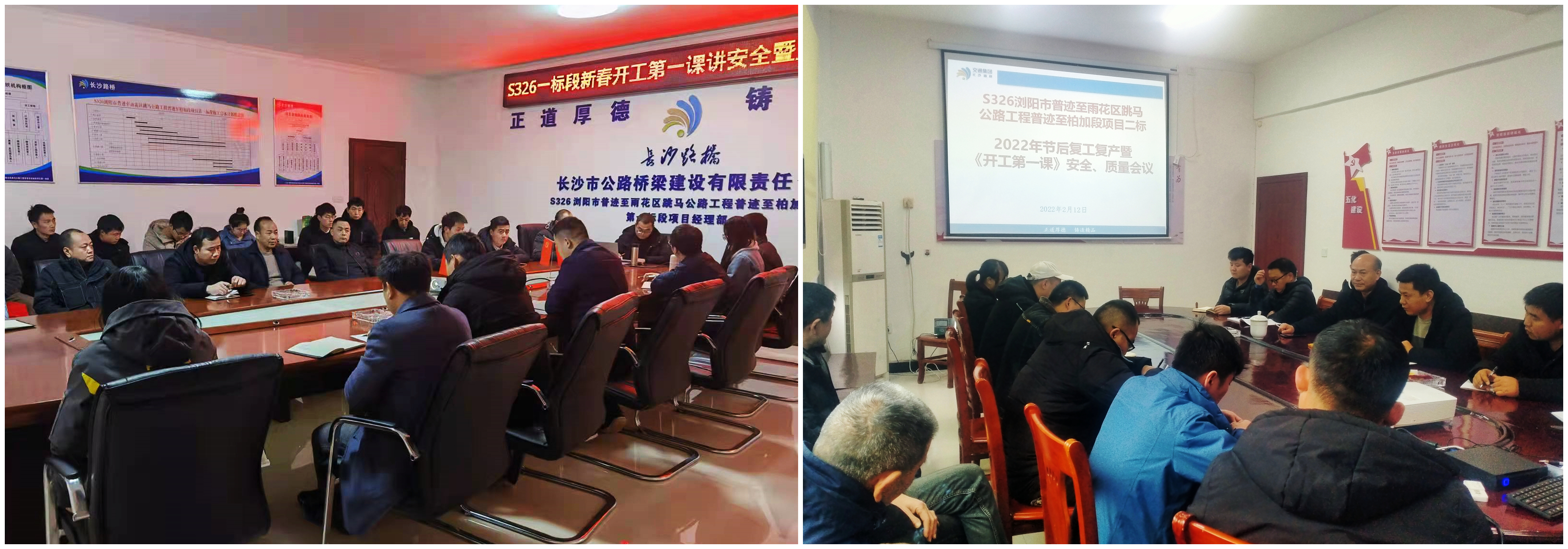2月12日,長沙路橋承建的S326瀏陽市普跡至雨花區(qū)跳馬公路工程普跡至柏加段項目第一、二標(biāo)段組織召開復(fù)工復(fù)產(chǎn)安全生產(chǎn)會議,開展“開工第一課講安全”活動,積極貫徹落實集團及公司的各項工作部署,切實踐行“一手抓防控疫情,一手抓復(fù)工復(fù)產(chǎn),兩手抓,兩不誤,兩促進”。
