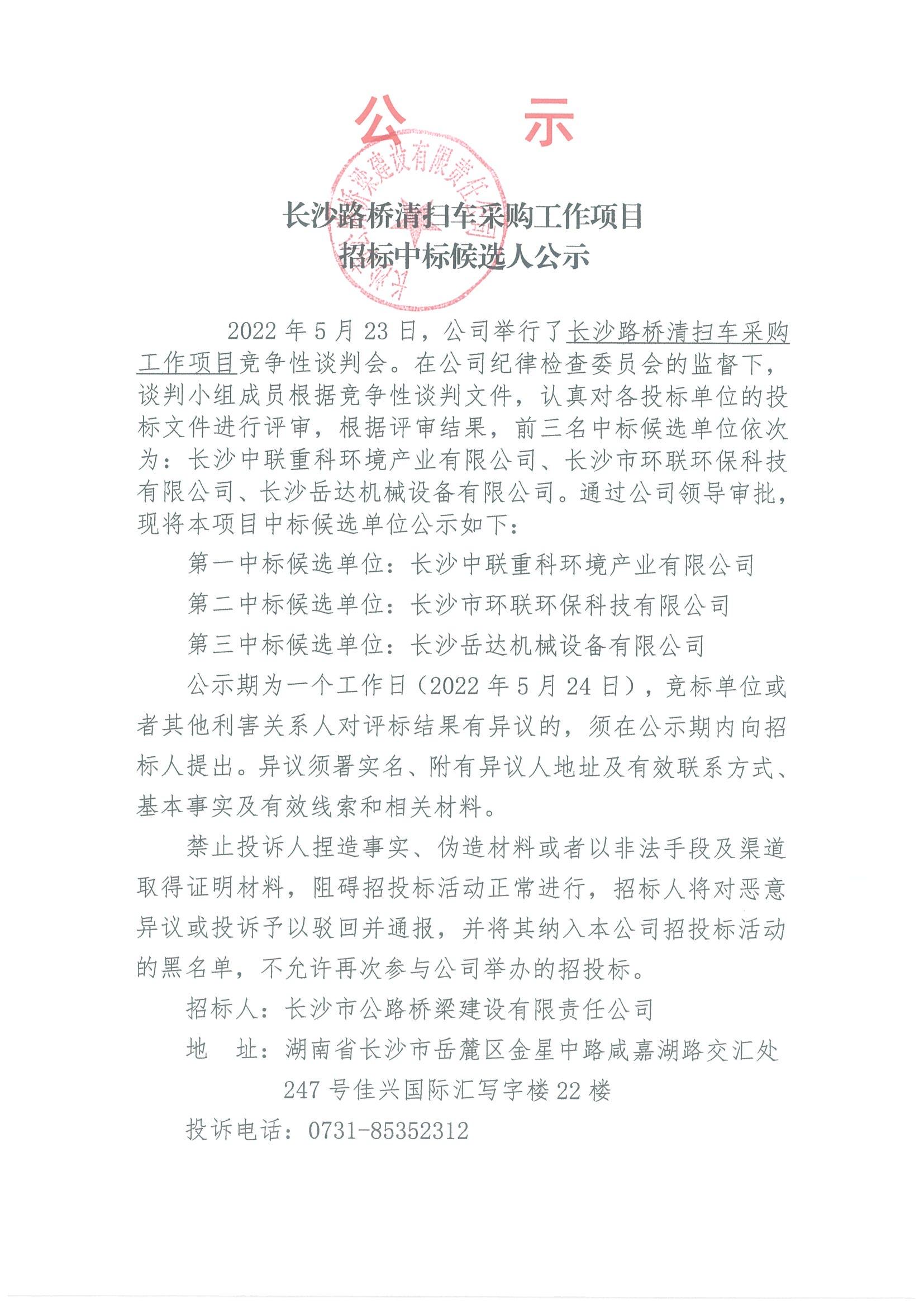 長沙路橋清掃車采購工作項(xiàng)目招標(biāo)中標(biāo)候選人公示